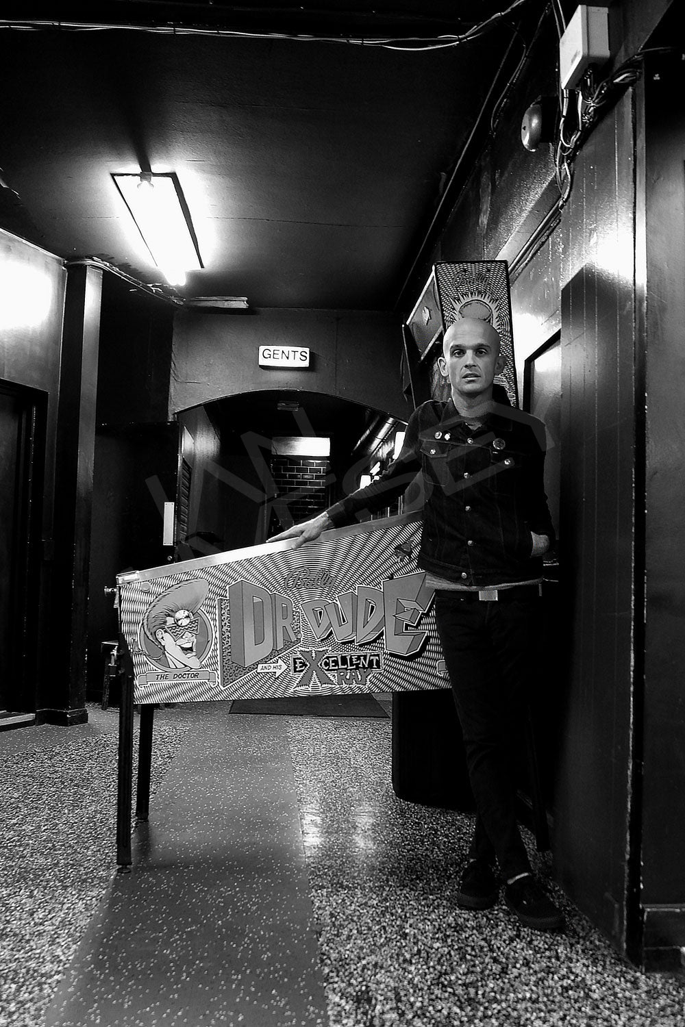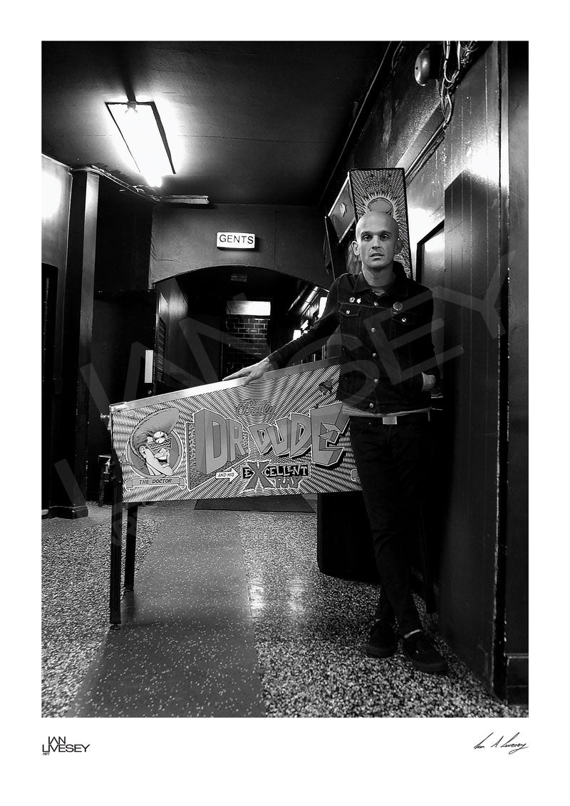 Zach Blair in front of the Dr Dude Pinball machine - Limited Print Run